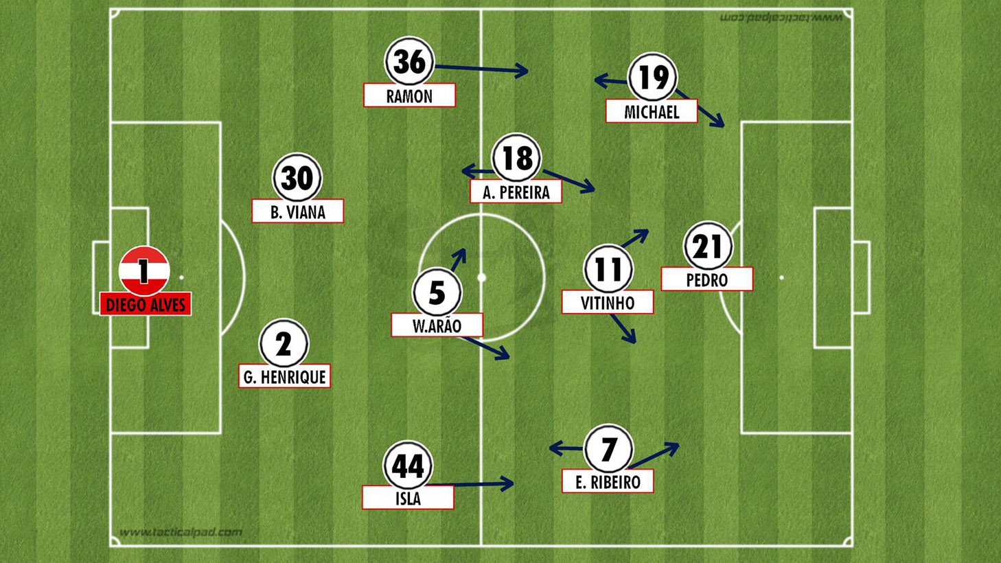 FLAMENGO: Diego Alves, Isla (Matheuzinho, 28’/2T), Gustavo Henrique, Bruno Viana e Ramon; Willian Arão e Andreas Pereira (João Gomes, 28’/2T); Everton Ribeiro (Thiago Maia, 18’/2T), Arrascaeta (Vitinho, 23’/1T) e Michael; Pedro (Rodinei, 28’/2T)