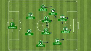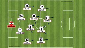 Mandou a campo um Palmeiras também num 4-2-3-1. Optou por Wesley, Raphael Veiga e Dudu como o trio atrás de Rony. Mais atrás a dupla de volantes com Danilo e Zé Rafael. Marcos Rocha e Piquerez nas laterais. Mas nada agressivo. Parece ser contra os próprios princípios da equipe. O Flamengo iniciou a partida a pressionar mais a saída de bola palmeirense. A predileção de Abel Ferreira é clara e quase única: chamar o adversário em busca do contragolpe fulminante e quase sempre muito bem executado. E explorar ao extremo as bolas longas para os jogadores de velocidade, especialmente nos lados do campo.