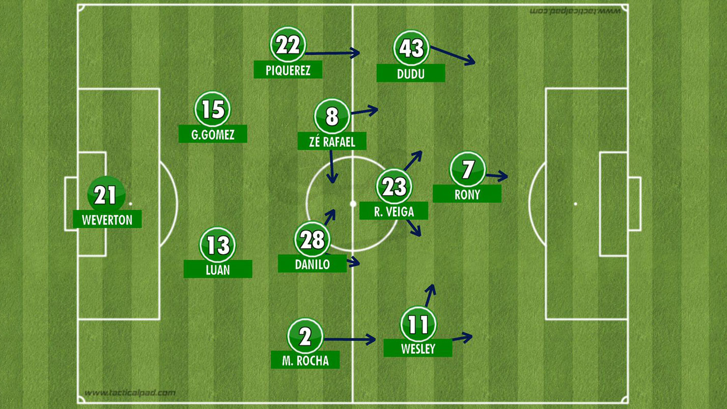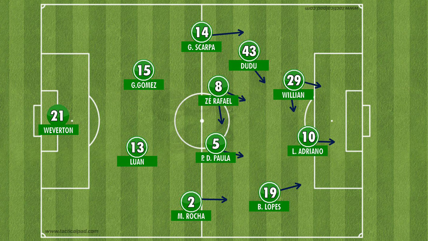 PALMEIRAS: Weverton, Marcos Rocha, Luan, Gómez e Piquerez (Willian, 27’/2T); Danilo (Patrick de Paula, 15’/2T) e Zé Rafael; Wesley (Breno Lopes, 15’/2T), Raphael Veiga (Gustavo Scarpa / Intervalo) e Dudu; Rony (Luiz Adriano, 15’/2T)