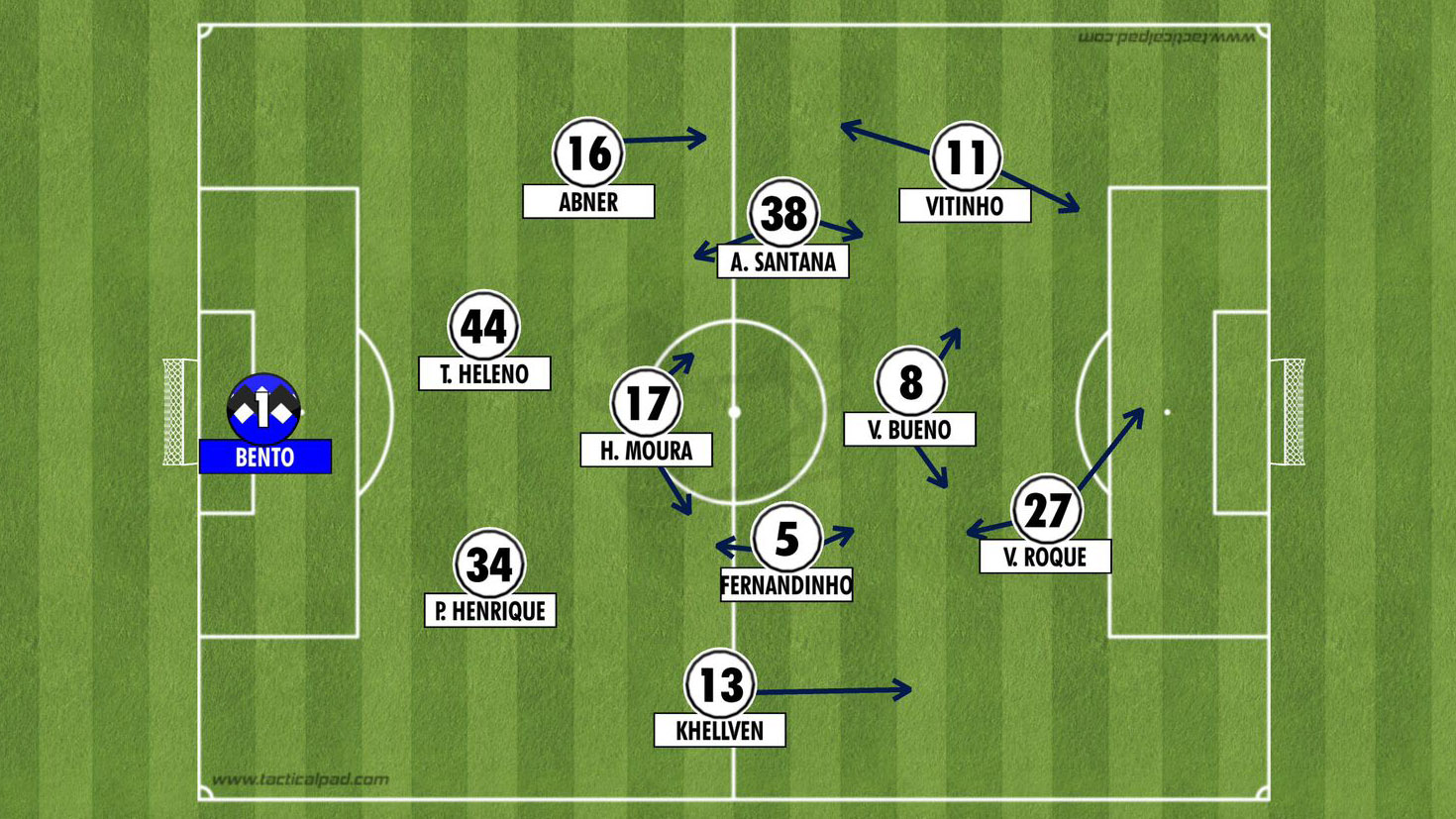 ATHLETICO-PR: Bento, Khellven, Pedro Henrique, Thiago Heleno e Abner; Hugo Moura (Terans, 30’/2T), Fernandinho, Alex Santana (Matheus Felipe / Intervalo) e Vitor Bueno (Canobbio, 11’/2T); Vitinho (Romulo, 11’/2T) e Vitor Roque (Pablo, 20’/2T)