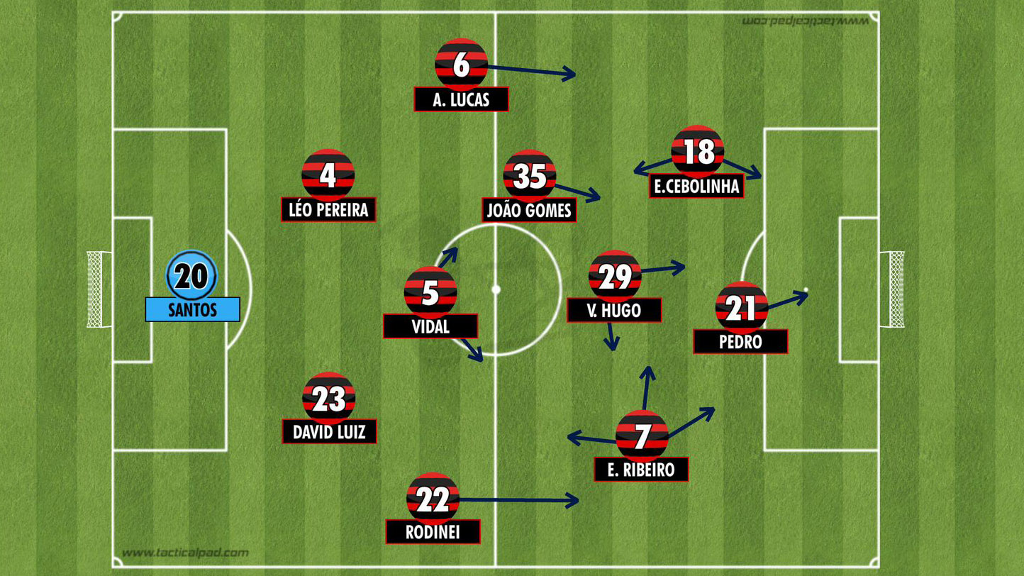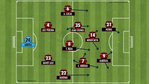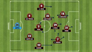 FLAMENGO: Santos, Rodinei, David Luiz, Léo Pereira e Filipe Luís (Ayrton Lucas, 19’/1T); Thiago Maia (Vidal, 25’/2T), João Gomes, Everton Ribeiro e Arrascaeta (Victor Hugo, 38’/2T); Gabigol (Everton Cebolinha, 38’/2T)