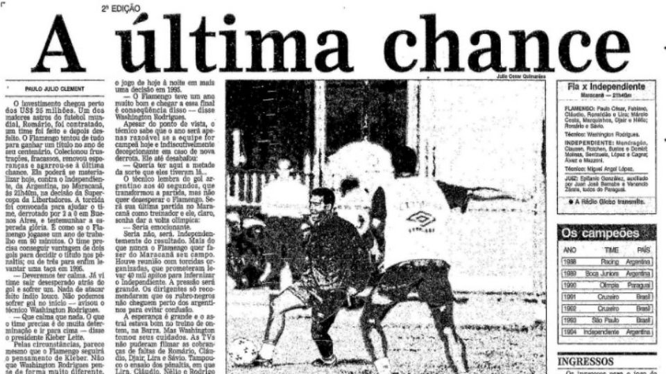 Mais de duas décadas atrás, o Maracanã recebeu sua primeira final sul-americana entre Flamengo e Independiente. Uma noite quente em 6 de dezembro de 1995 que entrou para a História rubro-negra com portões abertos, tragédia e espalhou frustração ao confirmar a ausência de títulos no ano do centenário. Um jogo que o Flamengo de Romário venceu, mas não levou a Supercopa diante de um Maracanã abarrotado por, estima-se, quase 120 mil pessoas. Um gosto amargo que perdura na lembrança dos rubro-negros.