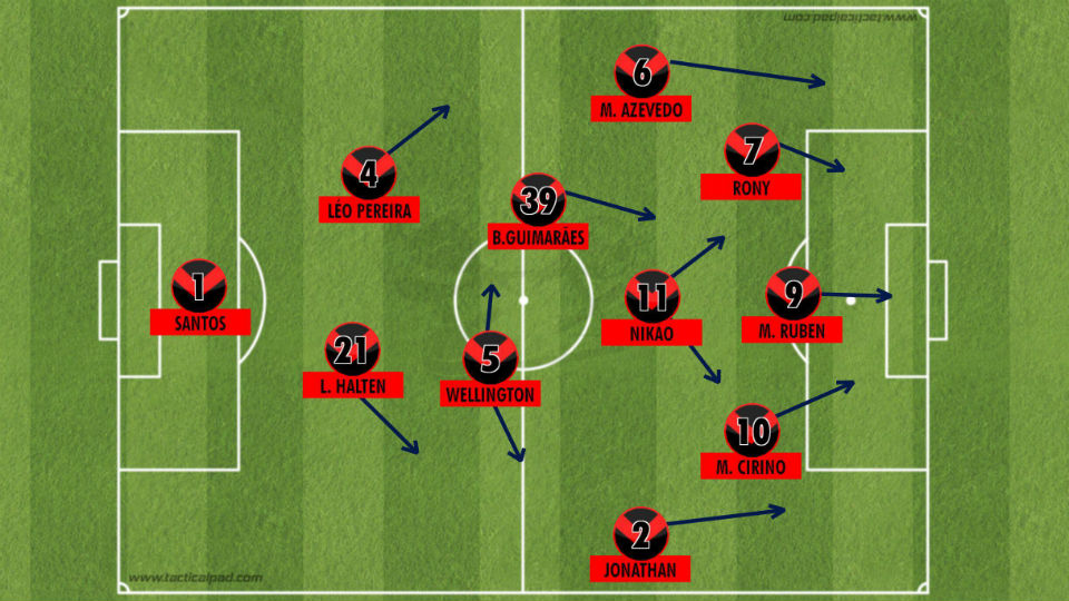 ATHLETICO-PR: Santos; Jonathan, Lucas Halter (Rodrigo Bambu, 7’/2T), Léo Pereira e Marcio Azevedo; Wellington e Bruno Guimarães; Marcelo Cirino (Vitinho, 40’/2T), Nikão (Bruno Nazario, 23’/2T) e Rony; Marco Ruben