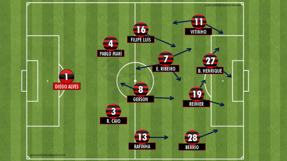 Joga como quem flutua num conto de fadas da bola grudada aos seus pés, caindo ao dentro quando abria o corredor para Rafinha ou em busca do lado esquerdo para infernizar Uendel e exigir presença de Patrick. Foi numa quebrada para dentro que o Camisa 7 achou Gabigol pelo meio, escancarado. O giro do artilheiro para deixar Klaus constrangido levantou o Maracanã. E Bruno, então, tentou derrubá-lo ao recorrer de forma até infantil a um puxão descarado quando só restava Lomba pela frente. Pênalti bem marcado e expulsão correta a um jogador que nem mesmo tentou disputar a bola. Tratou de parar o lance sem nem pensar. Gabigol, pela 32ª vez na temporada, anotou a penalidade. 1 a 0.