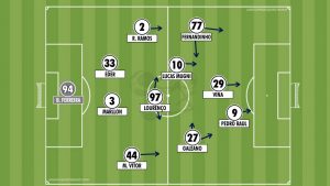 Mais maduro, capaz de compreender as limitações do corpo e da mente, o uruguaio colecionou 18 gols no Brasileiro. Fez tudo girar, especialmente após a luxuosa companhia de Jorginho. Volante capaz de controlar o meio-de-campo como poucos. Ah, pois sim: o Flamengo entrou desta maneira no Maracanã. Um 4-4-2 para enfrentar um Ceará que indicaria um 4-3-3, mas, na verdade, era um 4-5-1. Ferrolho mesmo para encarar o time mais ofensivo do campeonato, invicto em seus domínios. Léo Condé admitia a superioridade. Sabia que como os outros 19 times do campeonato não teria a posse de bola. Tentou, portanto, negar espaços como virou costume dizer. Se houve derrapadas no mental, na técnica e na tática – como contra Fortaleza, Santos, Fluminense – desta vez o Flamengo estava inteiro entregue ao jogo. Poderia até alternar bola de lado a outro, mas buscava as infiltrações na área, um passe mais vertical. O drible com Samuel Lino.
