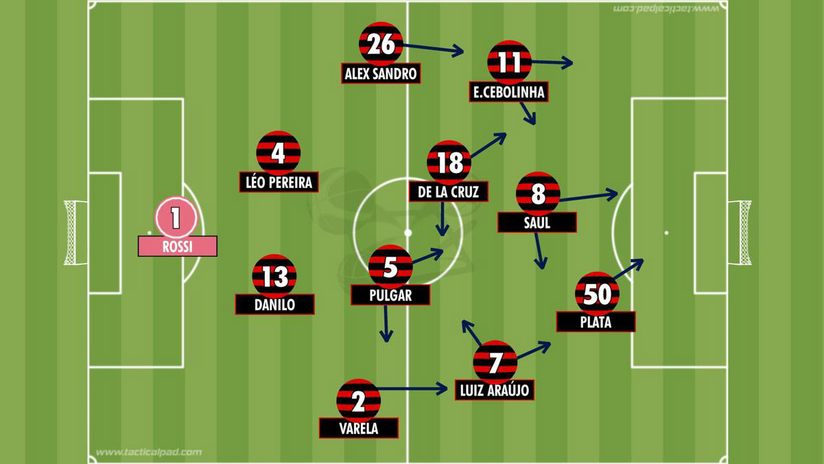 FLAMENGO: Rossi, Varela, Danilo, Léo Pereira e Alex Sandro; Pulgar, Jorginho (De La Cruz, 40’/2T), Samuel Lino (Everton Cebolinha, 17’/2T) e Carrascal (Luiz Araújo, 30’/2T); Arrascaeta (Plata, 17’/2T) e Bruno Henrique (Saúl, 40’/2T)