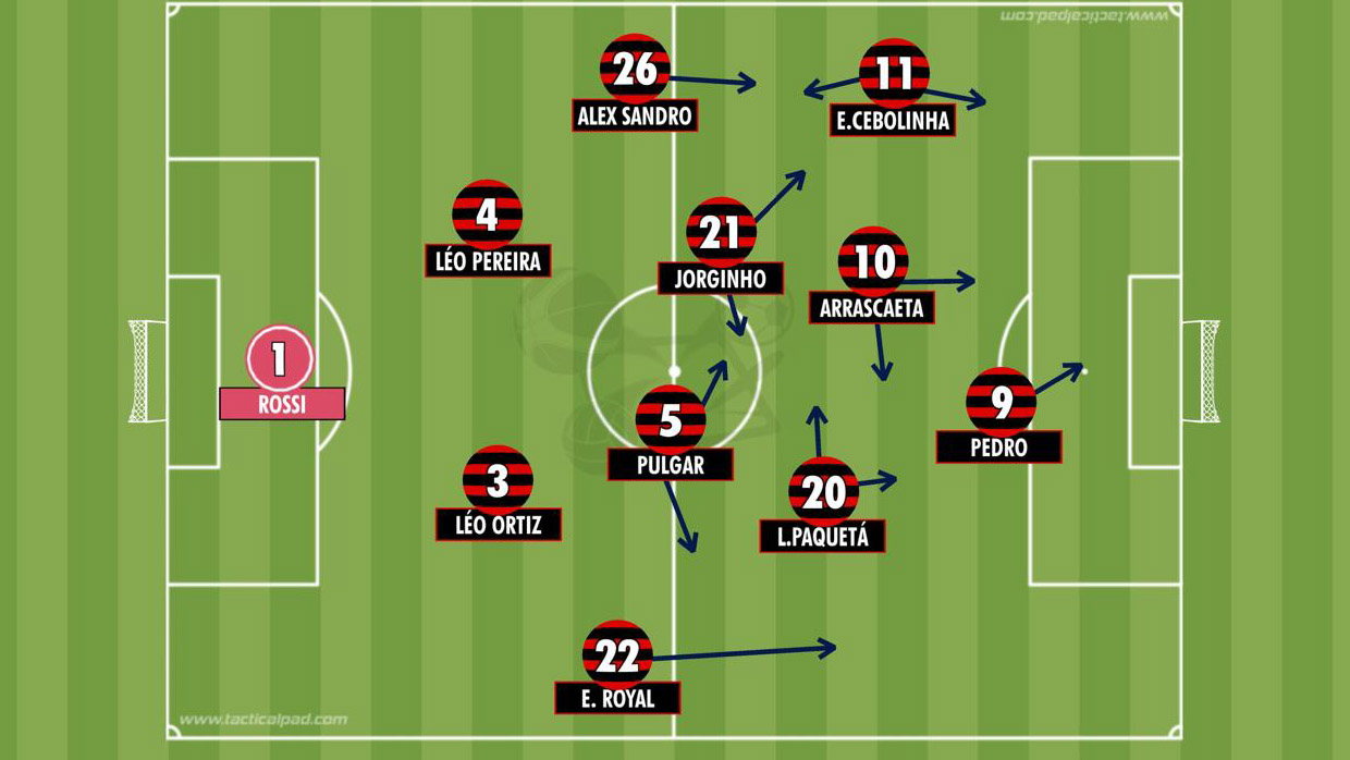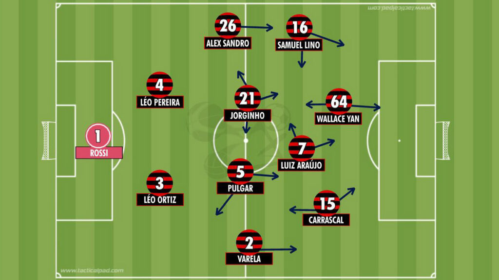 FLAMENGO: Rossi, Emerson Royal (Varela, 28’/2T), Léo Ortiz, Léo Pereira e Alex Sandro; Pulgar e Jorginho; Lucas Paquetá (Carrascal, 28’/2T), Arrascaeta (Walllace Yan, 43’/2T) e Everton Cebolinha (Samuel Lino, 19’/2T); Pedro (Luiz Araújo, 43’/2T)